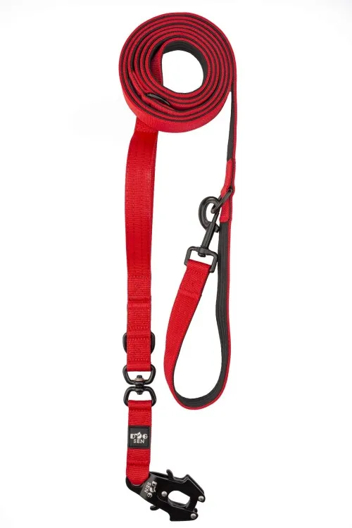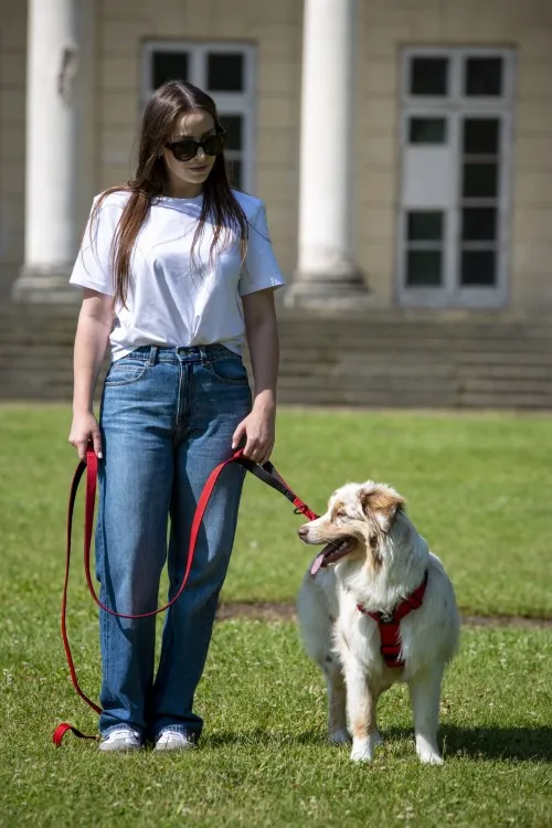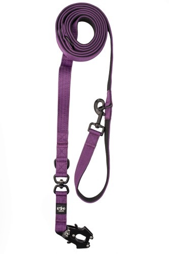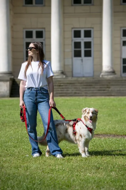 To co wyróżnia ten nasycony, różowy model, to aż trzy oddzielne miejsca wpięcia oraz wyposażenie obydwu końców w twarde, metalowe karabińczyki. Taki format powoduje, że w dwie sekundy smycz może stać się bardzo krótka w centrum miasta, lub długa i luźna na otwartym wybiegu. Możesz ją nawet wygodnie zapiąć w poprzek swojego tułowia, zwalniając całkowicie ręce. Obecne tu zapięcia obrotowe rozwiązują przy okazji frustrujący kłopot zawijania się linki wokół łap psa.