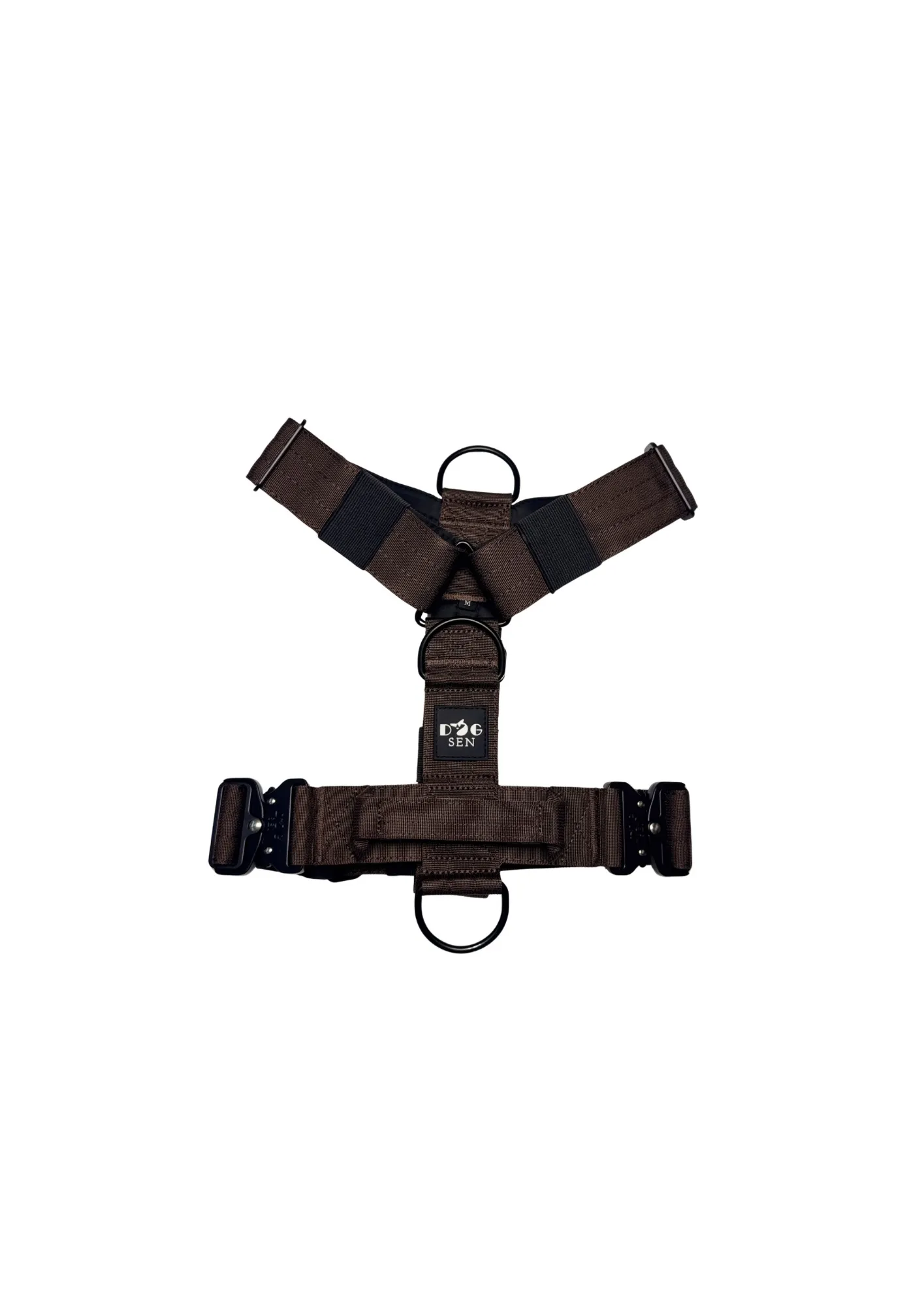 Brązowe szelki taktyczne IronHarness — niesłychana siła, komfortowe wsparcie tułowia i survivalowy kamuflaż dla psów aktywnych