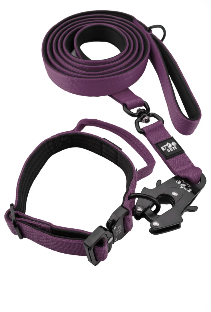 Podstawę zestawu stanowi fioletowa obroża, utkana z twardych, niepodatnych na zniszczenia materiałów, co przekłada się na długotrwałą żywotność i relaks dla psa. Przyjemne w dotyku wykończenie od wewnątrz skutecznie blokuje powstawanie otarć, a pancerne zapięcie dba o stabilność w trakcie wędrówek. Fioletowa smycz miejska charakteryzuje się świetnie zoptymalizowaną długością — zapewnia opiekunowi sto procent władzy w miejskim zgiełku, nie odbierając przy tym psu radości z eksplorowania terenu.